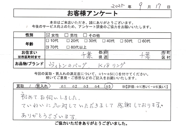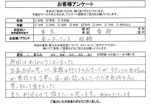 私の考え方として第一に『お客様の満足度』に重きを置き、その場限りでなく再度ご来店していただけるような温かみのある接客接遇を心掛けております。全てのお客様とお品物には少なからず思い出があると考えておりますので、様々な背景などをお話いただきながら出来る限り精一杯の対応をさせていただきたく思っております。