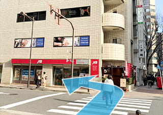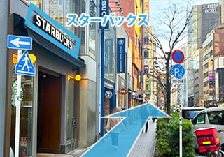 東銀座駅A8出口から地上に出て、左にUターンします。