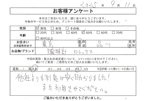 当店の月利息は10万円以上のお預かりで1.5%、100万円以上のお預かりで1.25%、1000万円以上のお預かりで0.9%と質屋業界最安水準の低利率となっており、審査なしで即日現金のご融資が可能です。また、当店の買取・質預かりブースはプライバシーに配慮した完全個室を2部屋をご用意しておりますので、高額のお取引き、大量のお品物のお持込み、初めてご利用いただく際など、他のお客様を気にせずにご利用いただけます。当店では査定料・手数料・キャンセル料は一切いただきませんので、ご相談だけでもお気軽にご利用ください。借入可能額を事前にご確認いただく際は、お電話・LINE・メールでもお問合せいただけます。ご来店時にお待たせせずに査定を始められる来店予約サービスもございますので、ご都合に合わせてお気軽に当店をご利用ください。