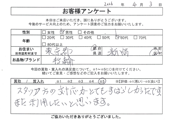 私は都内の買取・質の激戦区で10年以上の勤務経験があり、常にお客様にご納得いただける査定を心がけております。