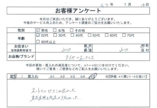 サイフを落として困っていた所 バングルを質入れでお金にかえていただきました。 とても助かりました。ありがとうございました。