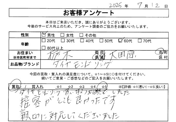 ダイヤモンドリング買い取りお願いしました。 接客がとても良かったです。 親切に対応してくださいました。