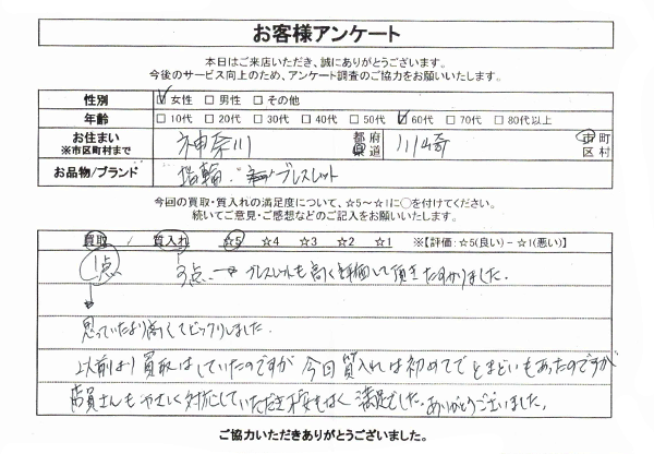 買取1点 思っていたより高くてビックリしました。 質入れ 3点 ブレスレットも高く評価して頂きたすかりました。 以前より買取はしていたのですが今回質入れは初めてでとまどいもあったのですが店員さんもやさしく対応していただき不安もなく満足でした。ありがとうございま...