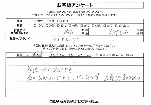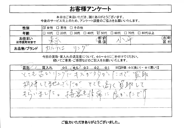 とても古いリングでキズが多かったので、買取期待してませんでしたが、とても高く買取してもらいました。接客も非常に良かったです