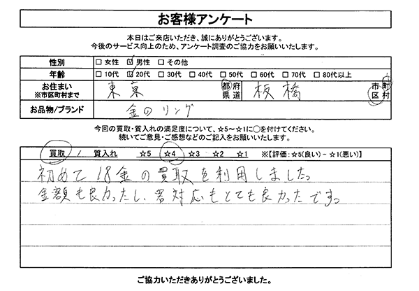 初めて18金の買取を利用しました。 金額も良かったし、客対応もとても良かったです。