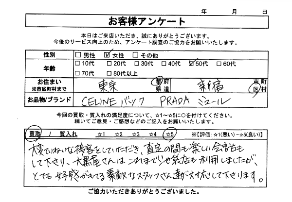 大変ていねいな接客をしていただき、査定の間も楽しい会話もして下さり、大黒屋さんはこれまで池袋店も利用しましたが、とても好感がもてる素敵なスタッフさん達が対応して下さります。