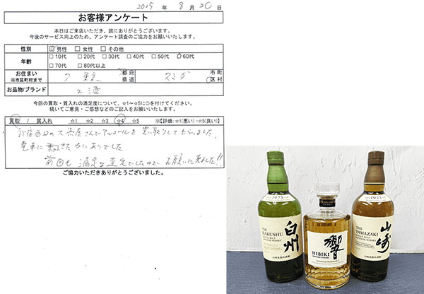 大黒屋池袋東口店でウイスキーをお買取していだきました。ていねいな接客と高い金額で買取ってくださり、大変満足でした。