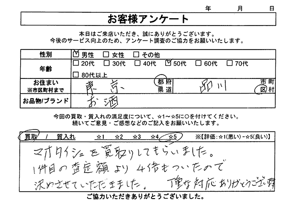 マオタイシュを買取りしてもらいました。 1件目の査定額より4倍もついたので決めさせていただきました。 丁寧な対応ありがとうございます。