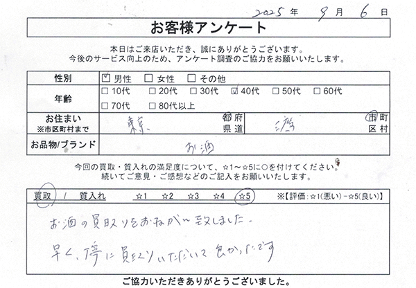 お酒の買取りをおねがい致しました。 早く、丁寧に買取りいただいて良かったです。