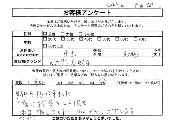 財布を持って来ました。 丁寧な接客をして頂き満足頂しました。ありがとうございます。