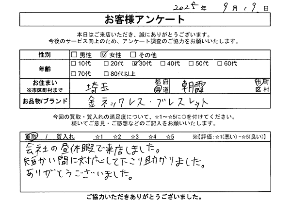 祖父からもらった18Kの指輪を丁寧に査定していただきました。金額もイメージ通りで気持ちよく売却させていただきました。(ご担当は、瀬尾さんでした)