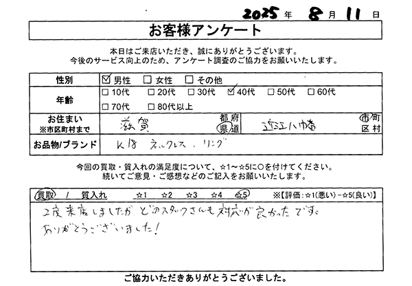 金のアクセサリーを査定してもらいました。 安心感のある接客で良かったです。