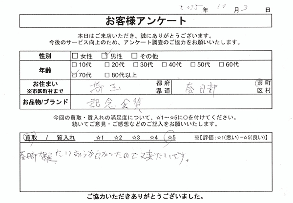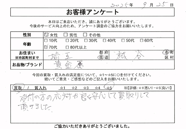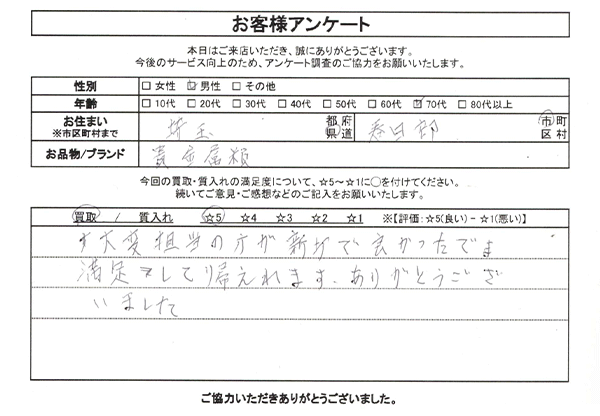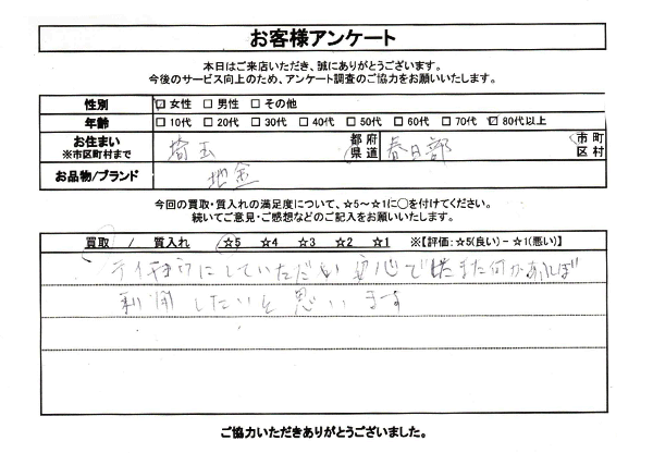 丁寧に査定していただいて安心した。 思ったより金額高かったのでうれしかった。