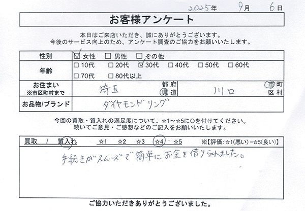 ダイヤモンド、思ったより高くかい取って頂き、感しゃしてます 店員さんが非常にかんじがよく、たいへん安心します。