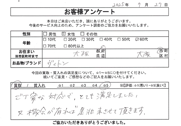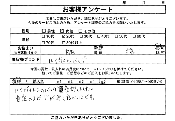 ルイヴィトンのバッグ売却しました。 査定のスピードが早く良かったです。