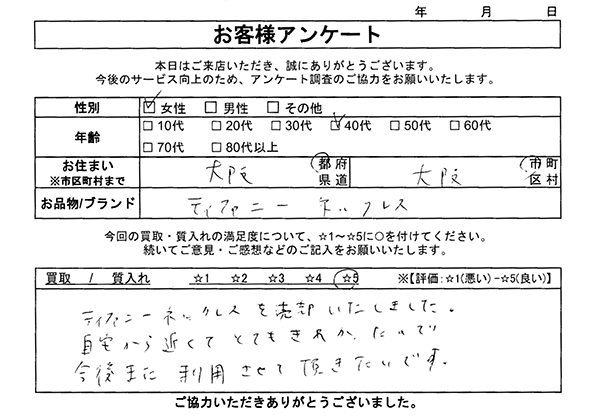 ティファニーネックレスを売却いたしました。 自宅から近くてとてもきれかったので 今後また利用させて頂きたいです。