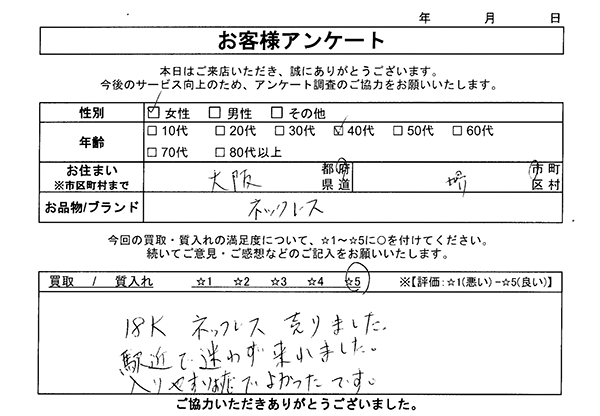 金のアクセサリーを査定してもらいました。 安心感のある接客で良かったです。