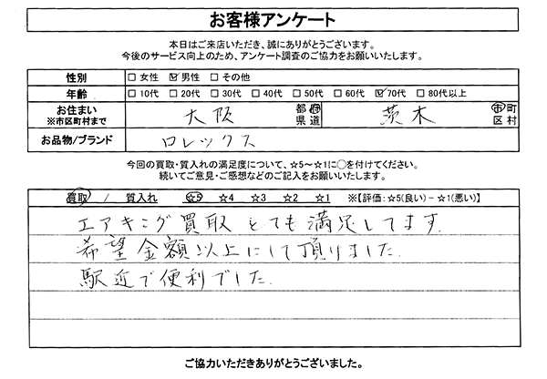 ロレックスを売りました。他店よりも早く、実直な感じは受けました。 今後ともよろしくお願いします。