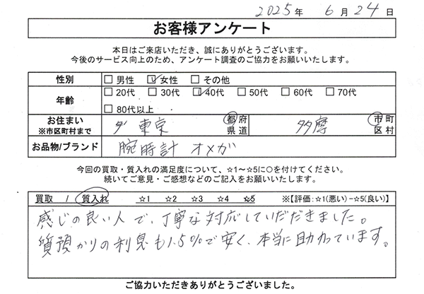 感じの良い人で、丁寧な対応していだだきました。 質預かりの利息も1.5%で安く、本当に助カっています。