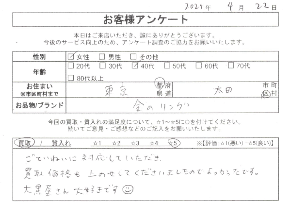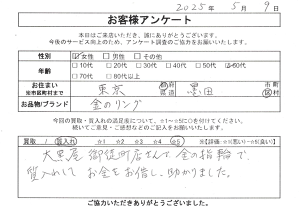 大黒屋御徒町店さんで金の指輪で質入れしてお金をお借し、助かりました。