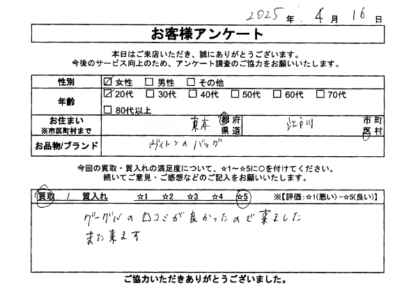 グッチのピアスが思ったより金額いかなくて残念でしたが総額が満足いく金額でした。 ありがとうございました