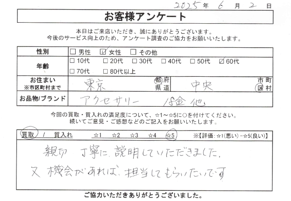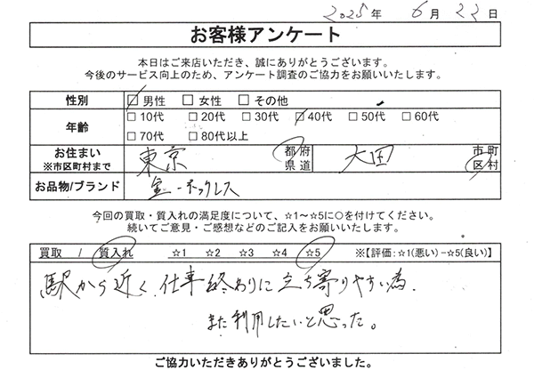 ティファニージュエリーを山口さんより買取り手続きをしてもらいました。身分証明書を忘れたにもかかわらず対応して頂きお手数をおかけしました。証明書を持参し、買取りの際もよく対応して頂き、ありがとうございました。
