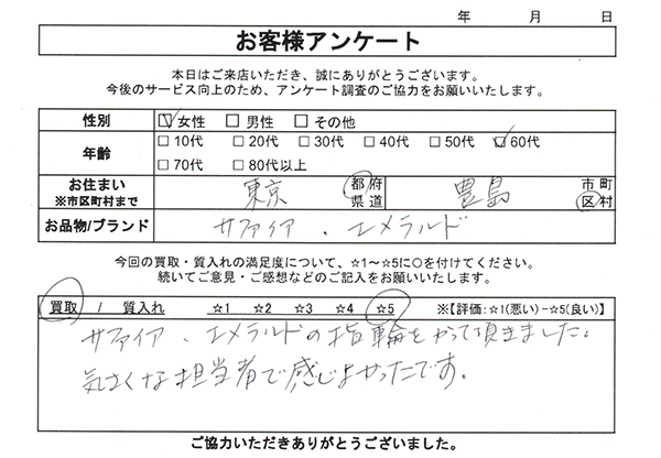 サファイア、エメラルドの指輪をかって頂きました。 気さくな担当者で感じよかったです。