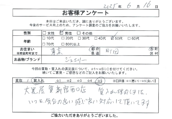 大黒屋質新宿西口店 質入れ理用しました。 いつも気分の良い 感じ良い対応して頂いてます