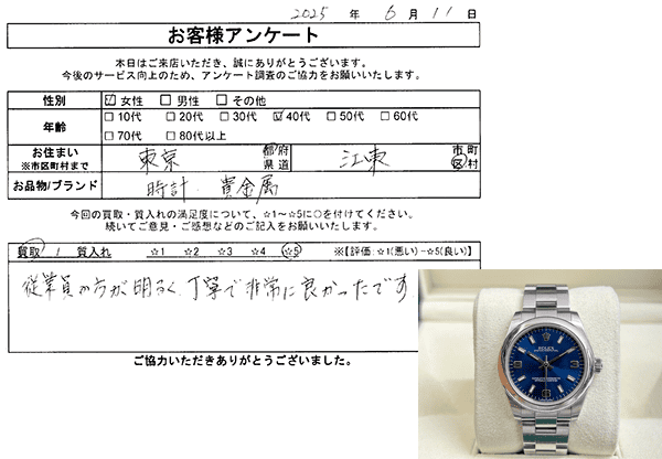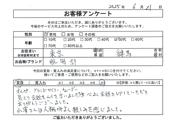 オメガ、グランドセイコー、チューダー 買とり金額をムリを言いましたが 心よく金額をUPしていただきありがとうございました。 小澤さんは人柄がよく親しみを感じました。