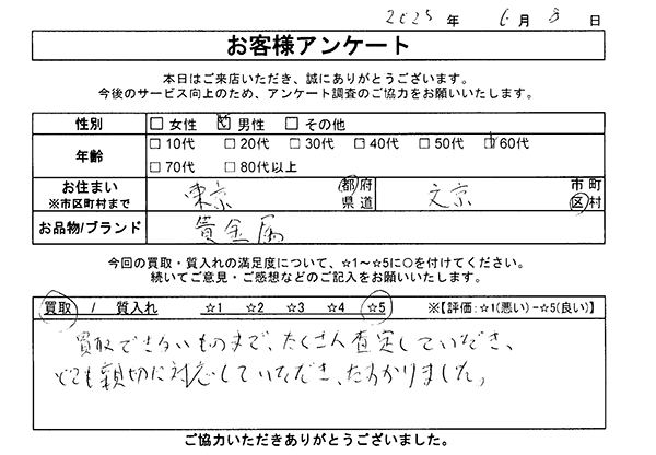 買取できないものまで、たくさん査定していだき、とても親切に対応していただき、たすかりました。