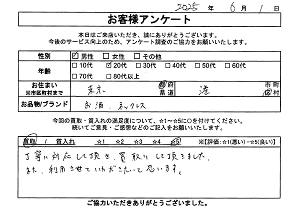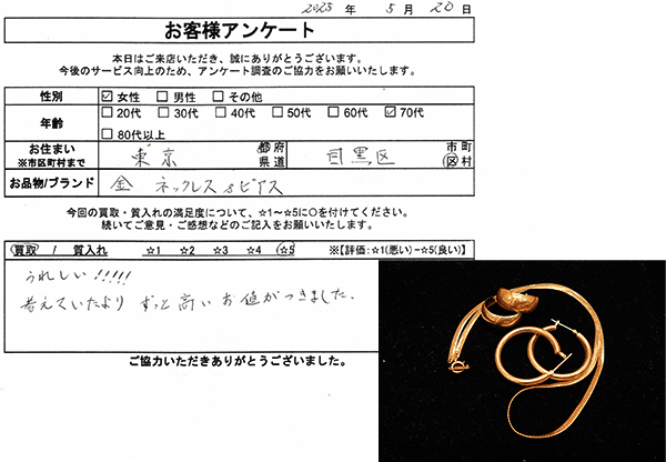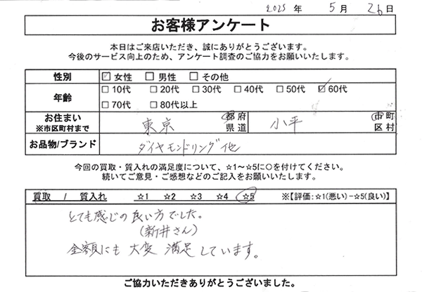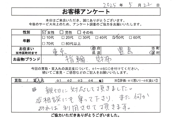 貴金属・指輪等 査定してもらい買取って頂きました。 分りやすい説明と丁ねいに対応してもらいました。 そして高価買取りしてもらえて嬉しかったです。