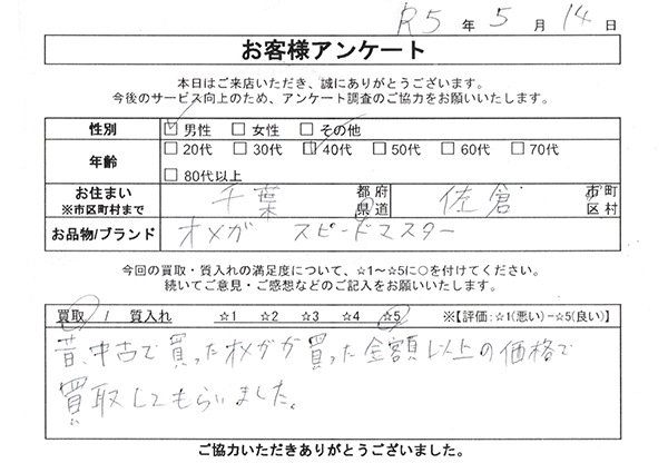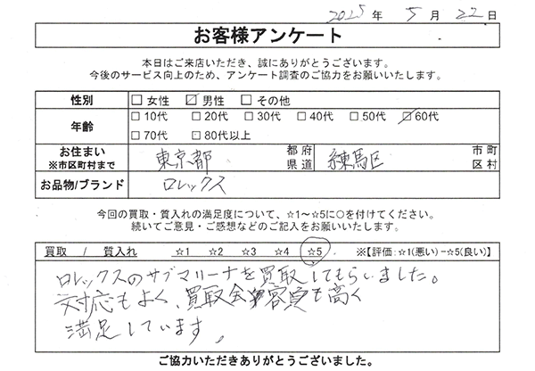 ロレックスのサブマリーナを買取してもらいました。 対応もよく、買取金額も高く満足しています。