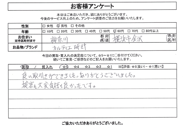 今回グランドセイコーの時計を買い取っていただきました。 一発で納得のいく買取金額を提示していただけて大変ありがたかったです。また機会があれば利用したいです。