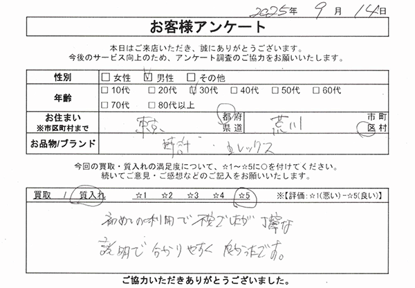 本日御徒町大黒屋さんにてロレックスを買い取っていただきました。 金額面でも頑張っていただくことができ、気持ちのよいお取り引きができました。大切な物だったのでこちらでお願いして良かったです。ありがとうございました。