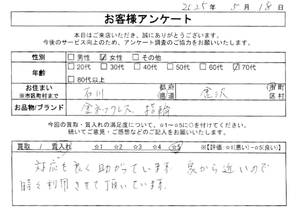 他店などより利率も良く、安心してあずけ入れできる。 接客もていねいで満足度が高い。