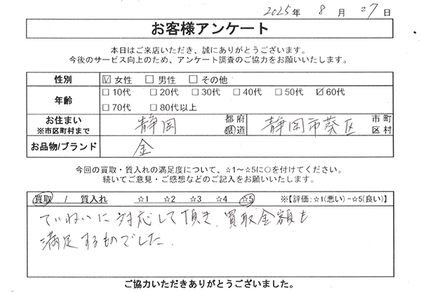 親切に説明していただいたので安心してお買取をおまかせできました。 ありがとうございました。