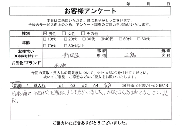 日本酒の十四代を買取りしてもらいました。対応よくありがとうございました。