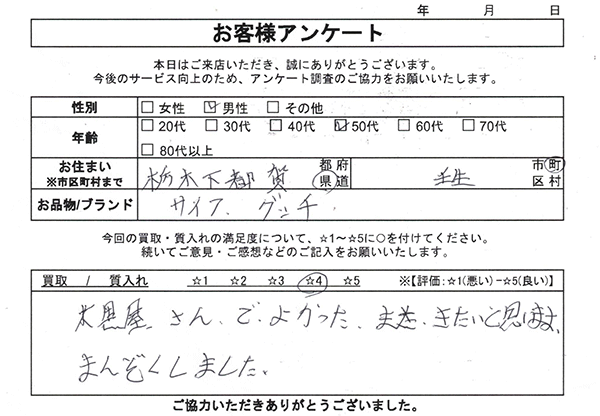 丁寧な接客で対応していただきました。 他店と同様な高額で買い取っていただき感謝です。