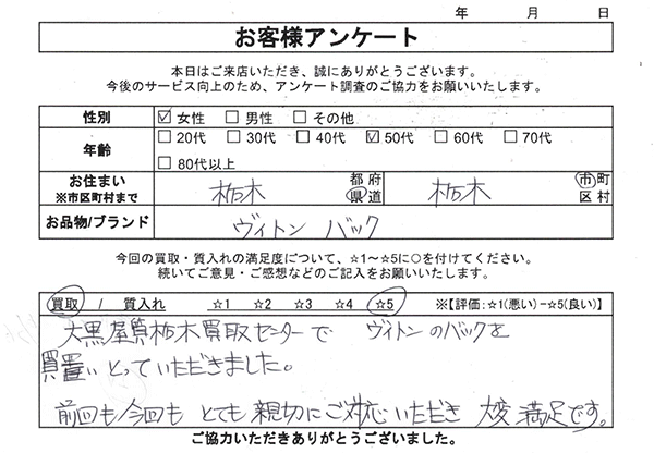 大黒屋 質栃木買取センターでヴィトンのバックを買いとっていただきました。 前回も今回もとても親切にご対応いただき大変満足です。