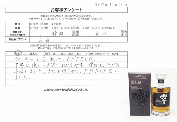 ウイスキーを買い取っていただきました。 丁寧な優しい対応、わかりやすい説明をいただき安心しました。また利用させていただきたく思いました。