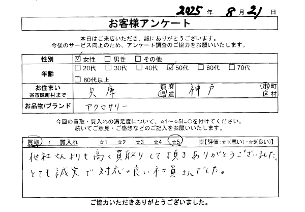 他社さんよりも高く買取りして頂きありがとうございました。 とても誠実で対応の良い社員さんでした。
