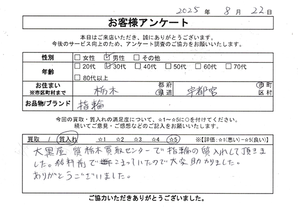 大黒屋 質栃木買取センターで指輪の質入れして頂きました。給料前でこまっていたので大変助かりました。 ありがとうございました。