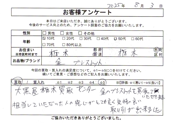 大黒屋 栃木買取センター、金のブレスレットを買い取っていただきました。 担当していただいた人の感じがとても良く気持の良い取り引が出来ました。