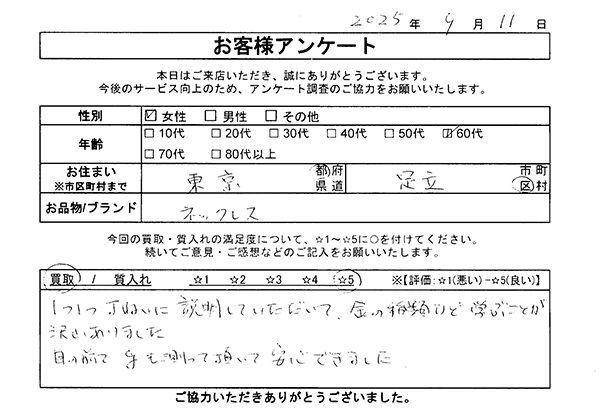 1つ1つ丁ねいに説明していただいて、金の種類など学ぶことが沢山ありました。 目の前で、gも測って頂いて、安心できました。